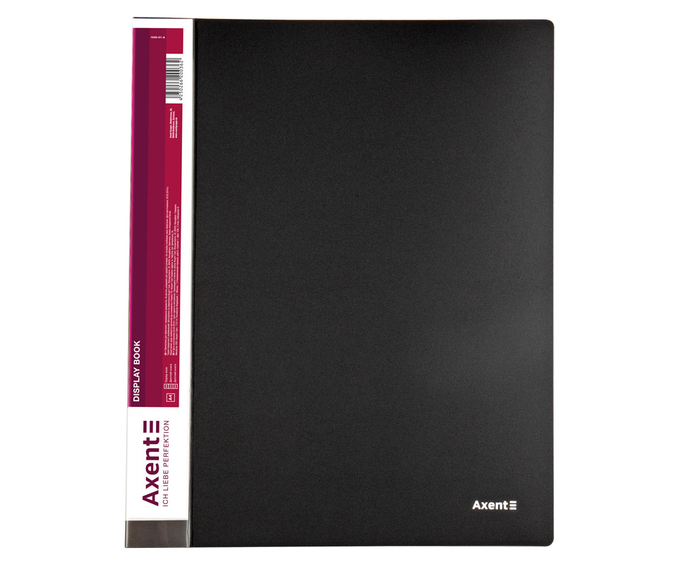 Display-book 40 files, black 1029. Display-books are a great solution for work, study and organization of personal archives and selections. By placing documents on a certain topic or project in a separate display book, you can not only solve the issue of convenient systematization and storage of documents, but also, if necessary, take them with you and present them by simply flipping through the files in the display book. There is no need to buy files and folders separately, it is enough to choose a display book with the optimal number of files. Axent display books are made of primary polypropylene, the plastic density of the cover and files provides for their wear resistance and preservation of a presentable appearance during use. The files are securely soldered into the cover. The color of the cover coincides with the base, thanks to which the display books stand out on the shelf, and it is easy to find the right one by the color of the base.