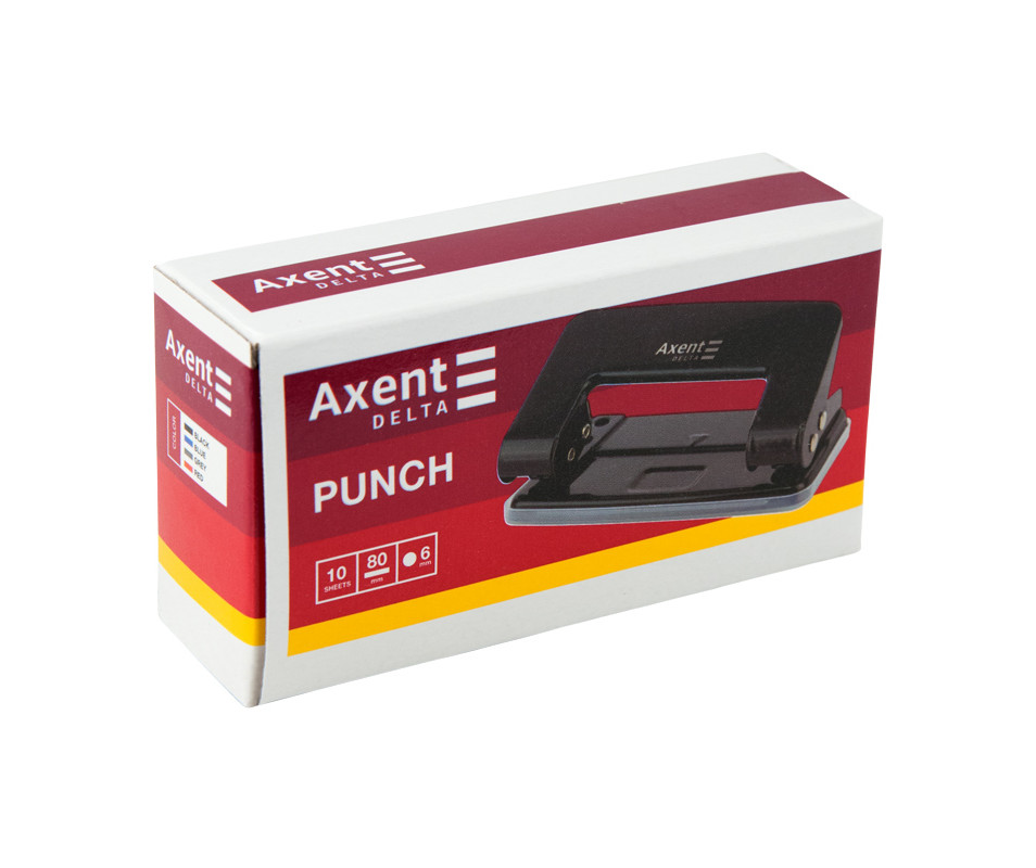 Дырокол металлический, 10л, черный 1077. Дырокол Delta by Axent имеет прочный металлический корпус и лаконичный дизайн. Все рабочие механизмы также выполнены из металла, устойчивы к нагрузкам. Пластиковая подошва бережет поверхность стола от царапин. Острые лезвия обеспечивают быстрое и точное пробитие. Съемный резервуар конфетты открывается мягко. Диаметр проема 6 мм.