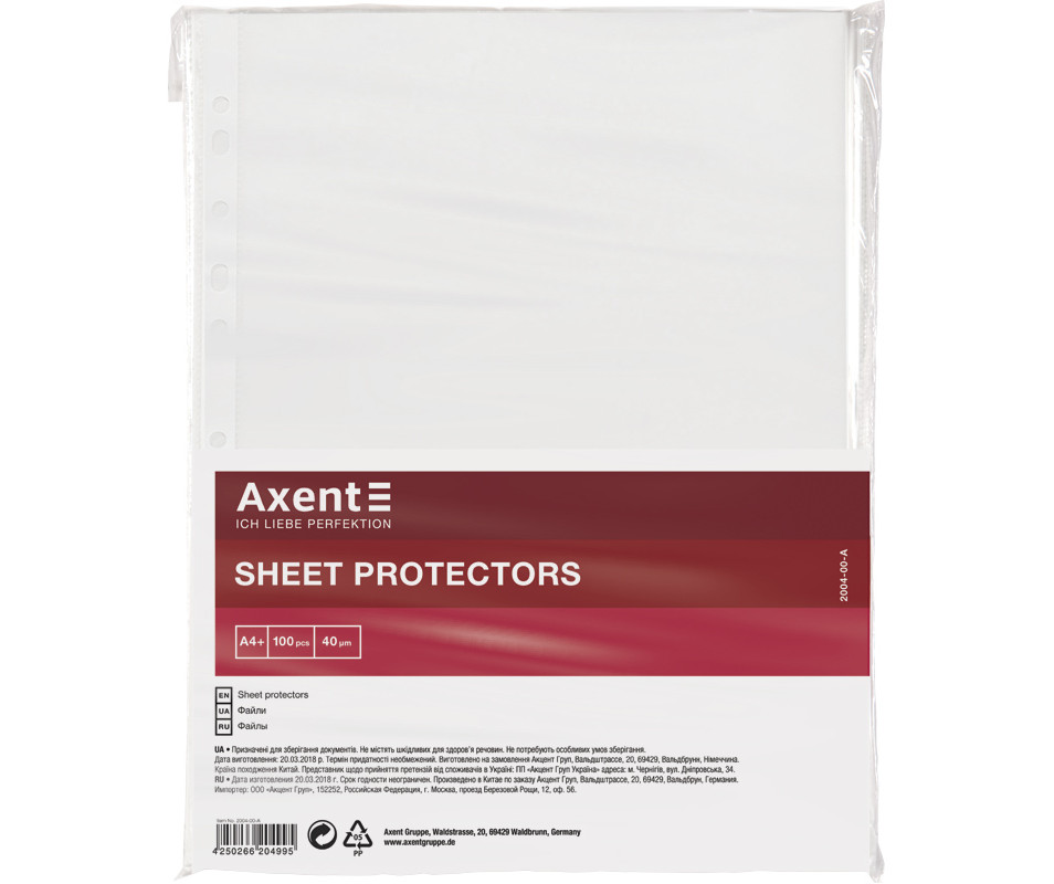 файлы A4+, глянцевые файлы, Axent 2004-00-A, офисные аксессуары, защитные файлы для документов, файлы с перфорацией, плотность 40 мкм, прозрачные файлы, систематизация документов, долговечные пластиковые файлы