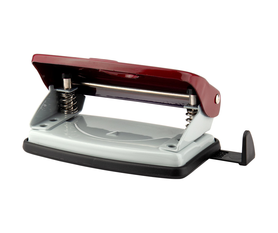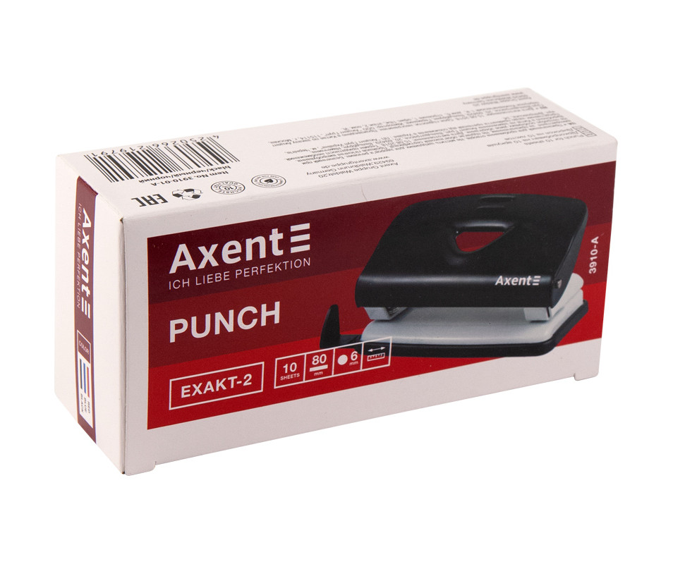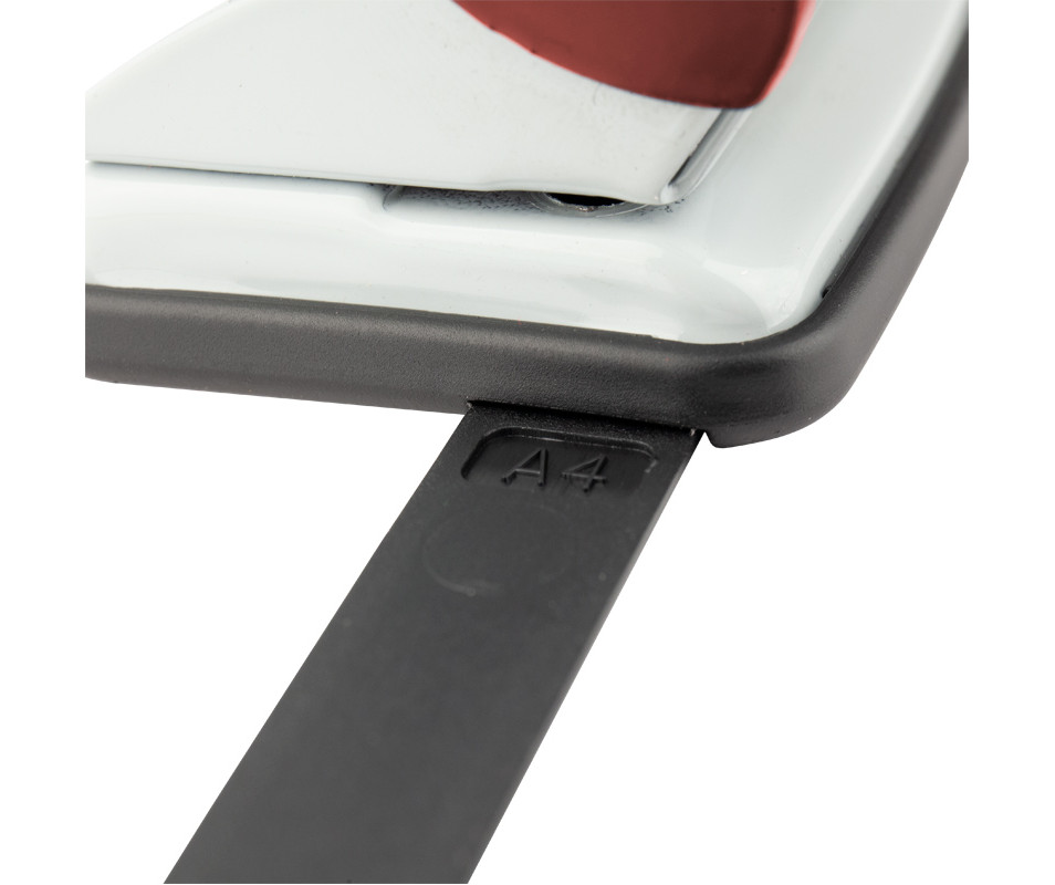 Hole punch Exakt-2 metal, 10 sheets, red 1046. Hole punch Exakt-2 belongs to the metal series. A strong metal body and a reliable metal mechanism ensure comfortable operation of the hole punch and its durability, even under intense load. Blades stay sharp for a long time. For convenience, the hole punch is equipped with a retractable limiting ruler with an accurate scale of paper formats (A3, A4, A5). The retractable ruler is necessary for positioning the sheets of paper that are inserted into the hole puncher, and allows you to always get an accurate result and the same stacks of bound documents with matching holes. The removable confetti tank opens gently. The rubberized sole prevents the hole punch from sliding on the surface. The diameter of the hole is 6 mm, the distance between the punched holes is 80 mm.
