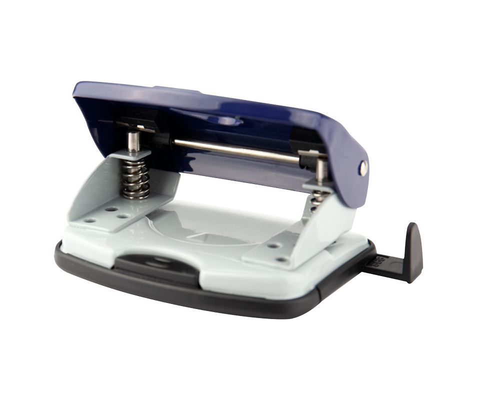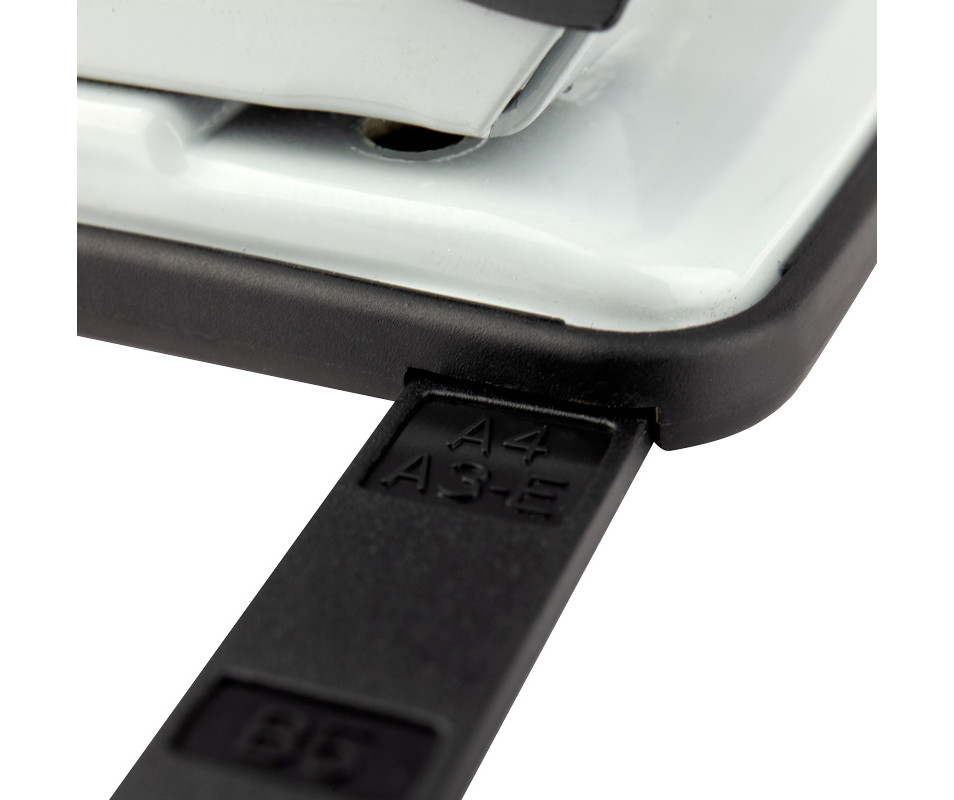 Hole punch Exakt-2 metal, 20 sheets, blue 1048. Hole punch Exakt-2 belongs to the metal series. A strong metal body and a reliable metal mechanism ensure comfortable operation of the hole punch and its durability, even under intense load. Blades stay sharp for a long time. For convenience, the hole punch is equipped with a retractable limiting ruler with an accurate scale of paper formats (A3, A4, A5). The retractable ruler is necessary for positioning the sheets of paper that are inserted into the hole puncher, and allows you to always get an accurate result and the same stacks of bound documents with matching holes. The removable confetti tank opens gently. The rubberized sole prevents the hole punch from sliding on the surface. The diameter of the hole is 6 mm, the distance between the punched holes is 80 mm.