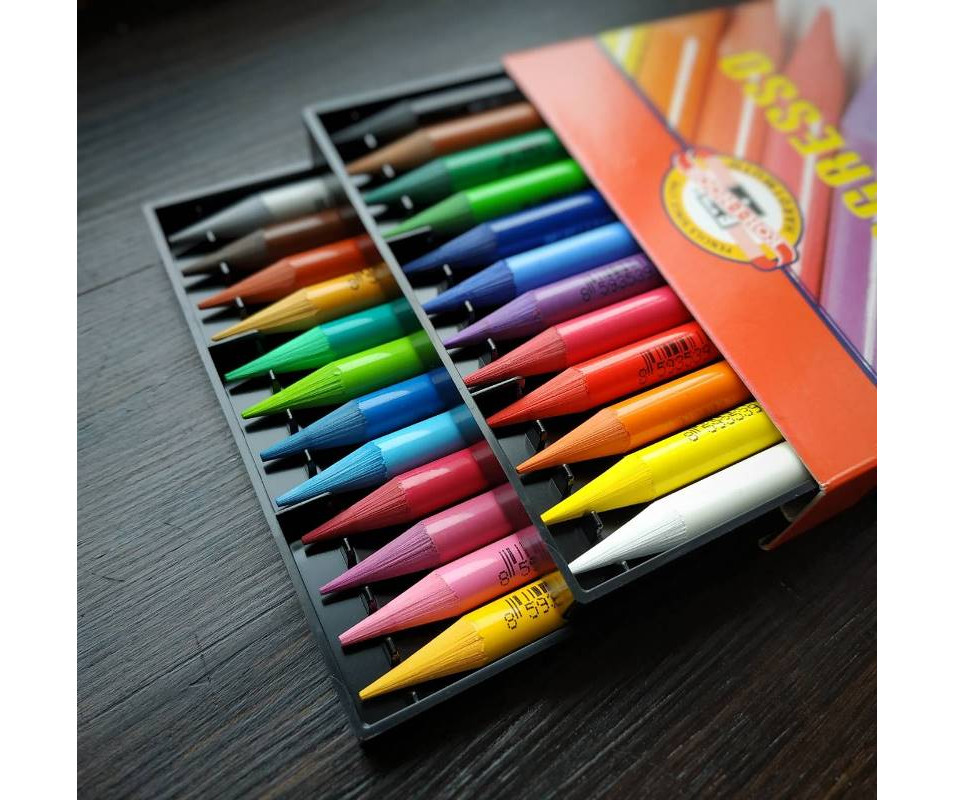 Карандаш может оставлять как тонкую линию, так и широкий след (если рисовать всей плоскостью грифеля). Покрытие – цветной лак.
