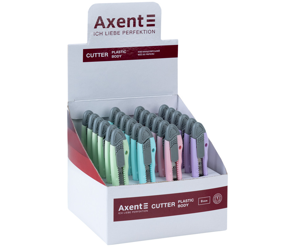 Universal knife 9 mm, mech lock, display 2632 Axent is a reliable, safe and durable tool for use in the office or at home due to the combination of the quality of the material and the reliability of the mechanism. Steel multi-section blade provides the highest functionality, stability, sharpness. The strong plastic case is resistant to loads, does not break when dropped. A reliable mechanism and blade lock ensures safe operation, eliminates the risk of the blade suddenly falling out or falling through. The cap with a groove allows you to easily and safely break off the blunt part of the blade along the notch line and continue to use the sharp blade. The knife has a hole in the handle for a lanyard. Thanks to the ergonomic case, the knife is comfortable to hold in the hand. Another nice feature is the bright color of the case, which is unusual for such instruments.