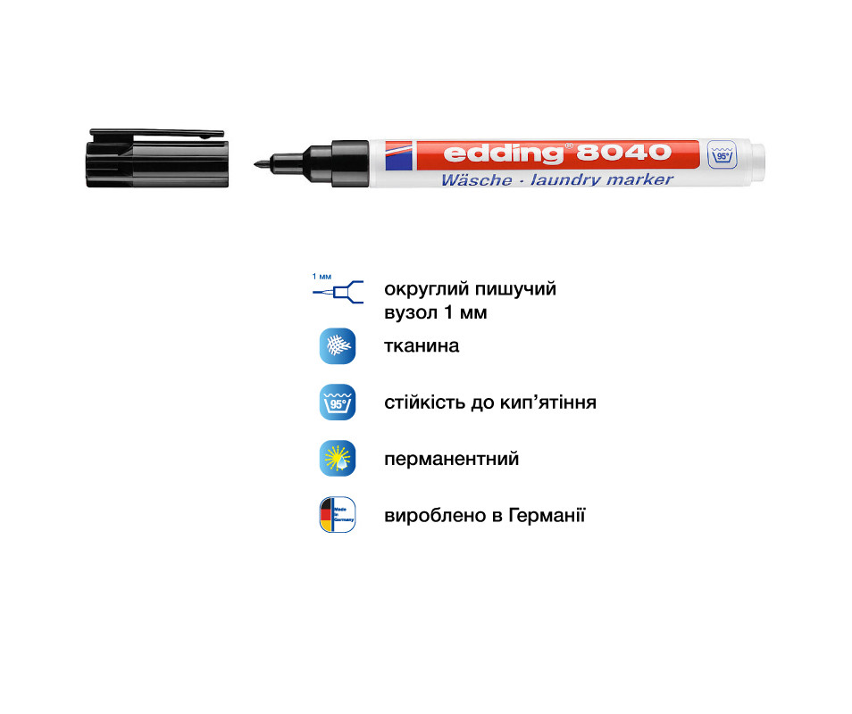 Маркер e-8040 ідеально підходить для нанесення міток на дитячі речі, для використання в дитячих садках, яслах, школах, піонерських таборах.