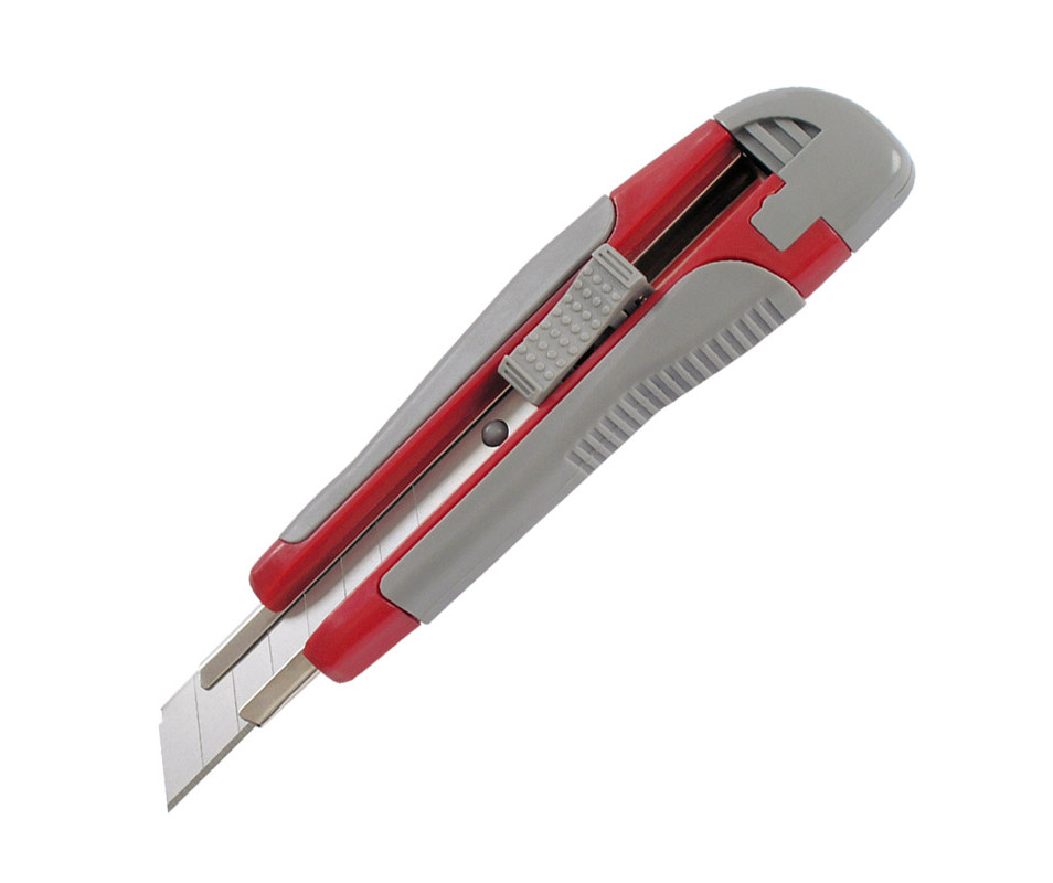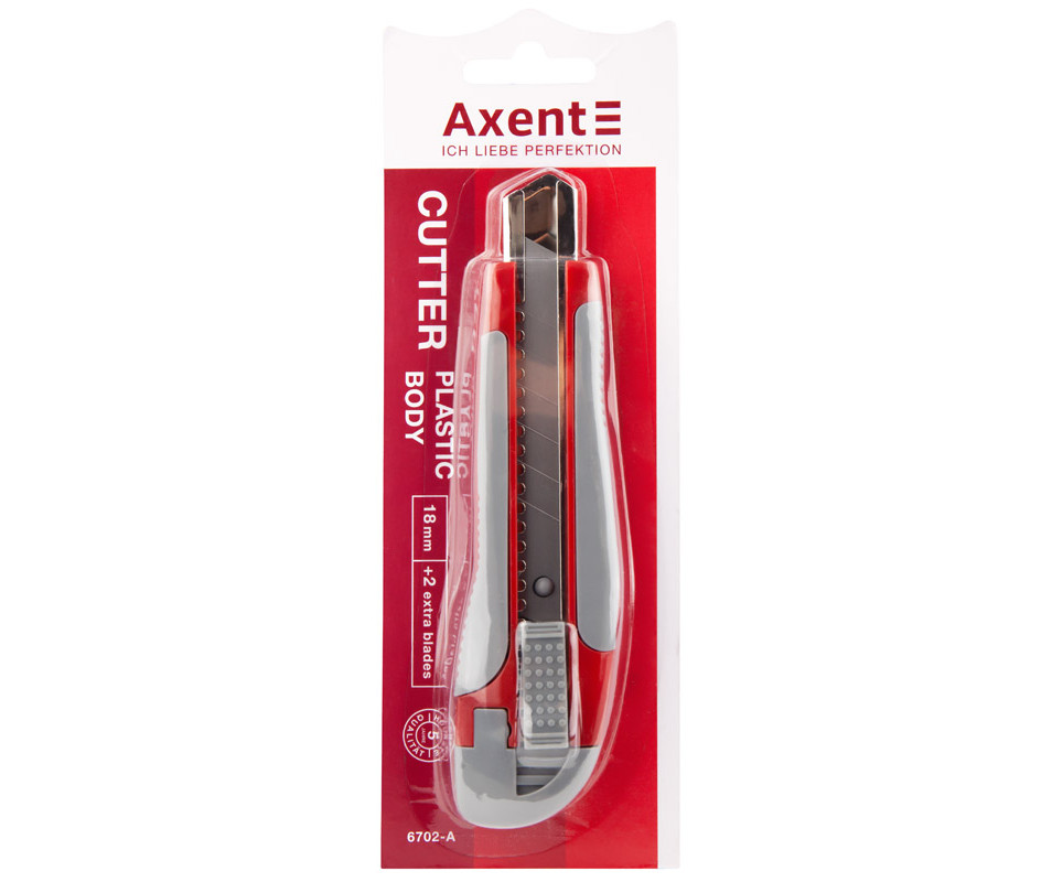 Ніж канцел, мет. направл, гум.вставки, 18мм, авто-фіксатор 2620. Канцелярський ніж Axent - це надійний, безпечний і довговічний інструмент для використання в офісі, на складі, на виробництві або в побуті завдяки поєднанню якості матеріалу, продуманості деталей і надійності механізму. Сталеве багатосекційне лезо забезпечує найвищу функціональність, стійкість, гостроту. Міцний пластиковий корпус стійкий до навантажень, не розбивається при падінні. Металевий механізм ступінчастої подачі леза забезпечує безпечну роботу, надійний механізм фіксації виключає ризик раптового випадіння або провалювання леза. Кришечка з пазом дозволяє просто і безпечно обламати затуплену частину леза уздовж лінії насічки і продовжувати користуватися гострим лезом. Ергономічний дизайн корпусу адаптований під форму долоні, гумові вставки запобігають ковзанню руки. Плюс 2 запасних леза!