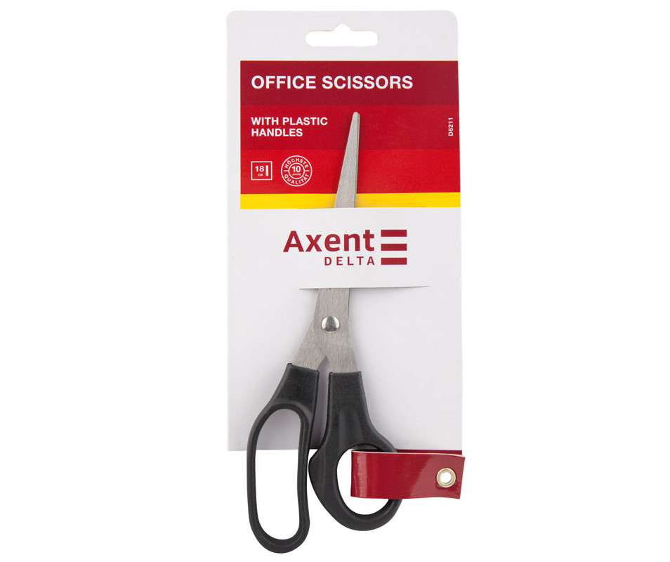 Ножницы, 18 см, черные, откр. блистер 2728 с пластиковыми ручками – используются для резки бумаги, картона, ткани и проч. Лезвия ножниц Delta by Axent – из качественной стали, прочные и стойкие к коррозии. Кончики лезвий закруглены для безопасной работы. Бумага разрезается легко и без смятия. Рукоятки из прочного пластика, устойчивы к нагрузкам. Ассиметричные кольца эргономичной формы обеспечивают комфорт в использовании.