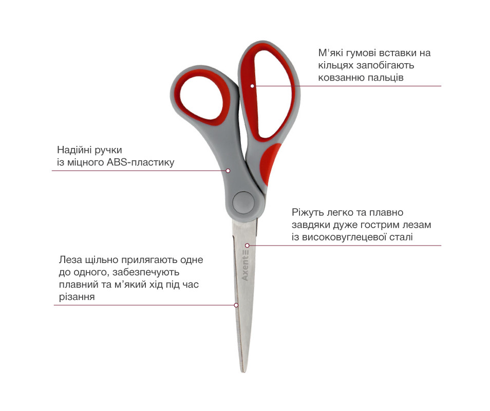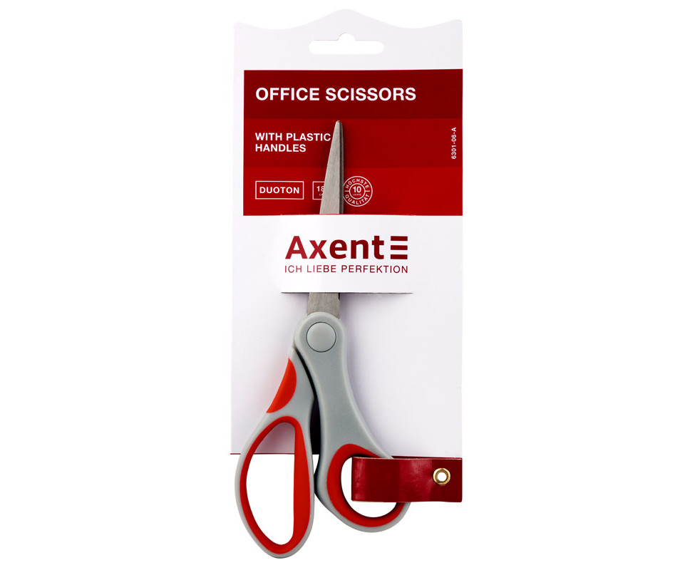 Ножницы Duoton, 18 см, серо-красные 2691 с пластиковыми ручками – используются для резки бумаги, картона, ткани и проч. Качественные материалы и монтаж, продуманные детали офисных ножниц Axent обеспечивают комфортную, безопасную работу и долговечность. Лезвия – из высококачественной стали, прочные и стойкие к коррозии, не требуют дополнительной заточки. Кончики лезвий закруглены для безопасной работы. Лезвия плотно прилегают друг к другу, обеспечивают плавный и мягкий ход. Бумага разрезается легко и без смятия. Рукоятки из прочного пластика, устойчивы к нагрузкам. Особенность ножниц серии Axent Duoton – асимметричные кольца эргономичной формы с резиновыми вставками, предотвращающими скольжение пальцев, обеспечивающие удобство и комфорт в использовании, и двухцветный дизайн в классических цветах Axent.