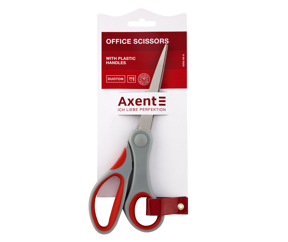 Ножницы Duoton, 20 см, серо-красные 2693 с пластиковыми ручками – используются для резки бумаги, картона, ткани и проч. Качественные материалы и монтаж, продуманные детали офисных ножниц Axent обеспечивают комфортную, безопасную работу и долговечность. Лезвия – из высококачественной стали, прочные и стойкие к коррозии, не нуждаются в дополнительной заточке. Кончики лезвий закруглены для безопасной работы. Лезвия плотно прилегают друг к другу, обеспечивают плавный и мягкий ход. Бумага разрезается легко и без смятия. Рукоятки из прочного пластика, устойчивы к нагрузкам. Особенность ножниц серии Axent Duoton – асимметричные кольца эргономичной формы с резиновыми вставками, предотвращающими скольжение пальцев, обеспечивающие удобство и комфорт в использовании, и двухцветный дизайн в классических цветах Axent.