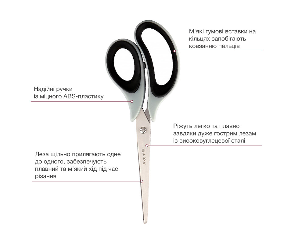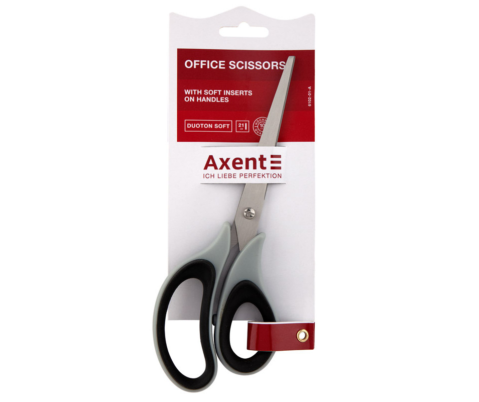 Ножницы Duoton Soft, 21 см, серо-черные 2690 с пластиковыми ручками – используются для резки бумаги, картона, ткани и т.д. Качественные материалы и монтаж, продуманные детали офисных ножниц Axent обеспечивают комфортную, безопасную работу и долговечность. Лезвия – из высококачественной стали, прочные и стойкие к коррозии, не нуждаются в дополнительной заточке. Кончики лезвий закруглены для безопасной работы. Лезвия плотно прилегают друг к другу, обеспечивают плавный и мягкий ход. Бумага разрезается легко и без смятия. Рукоятки из прочного пластика, устойчивы к нагрузкам. Особенность серии Axent Duoton Soft – мягкие резиновые вставки на кольцах, которые повышают удобство и комфорт использования, предотвращают скольжение пальцев. Эргономичная форма рукоятки повторяет анатомический изгиб ладони. Двухцветный дизайн в классических цветах Axent.