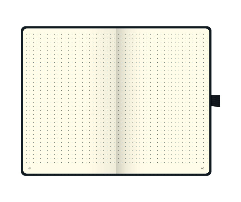 This notebook is A5 in size, making it easy to carry around. The cover is hard and black in color, with a Strong paper coating that provides extra protection. The color of the interior is cream. The paper density is 80 g/m². The book also has a pen loop, a secure fixing elastic band and a pocket for storing additional documents or small items.