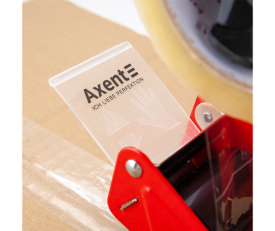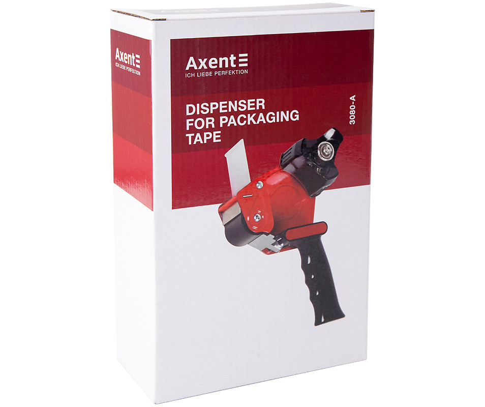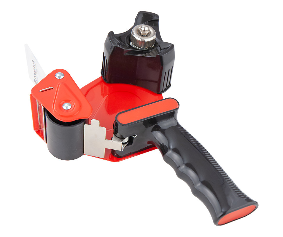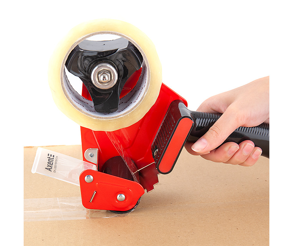 Диспенсер для упаковочного скотча. Цвет – красный. Пружинный механизм регулировки натяжения скотча для скотча длиной до 300 м и шириной до 50 мм.