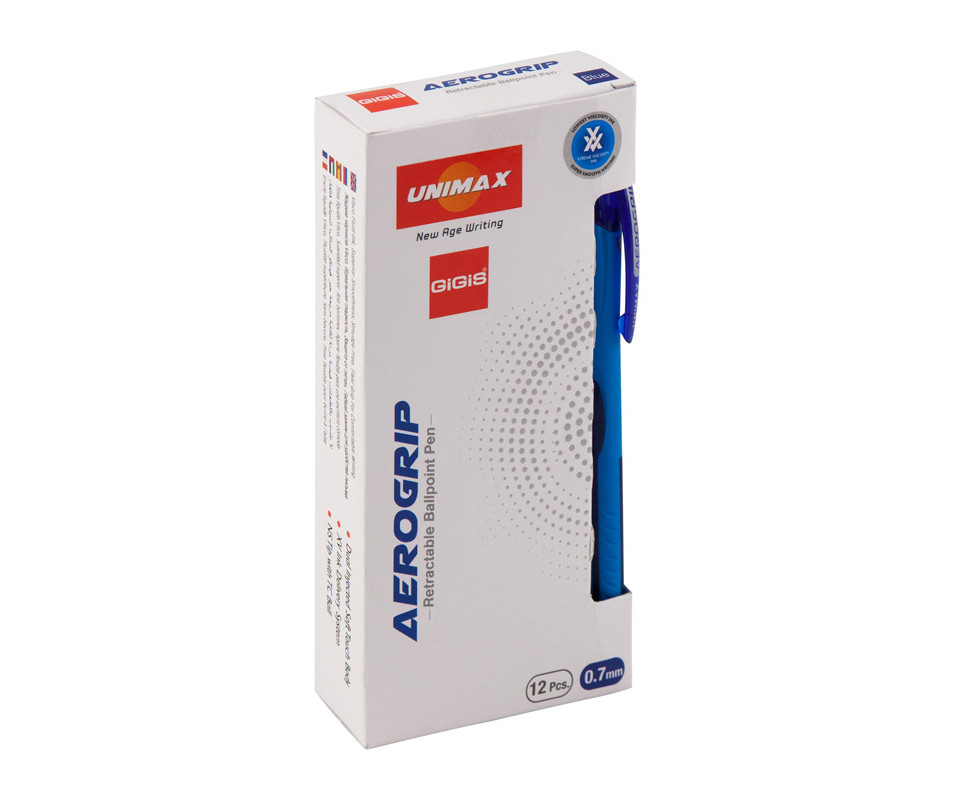 мРучка кулькова автом. Aerogrip, синя UX-136-02 з непрозорим прогумованим пластиковим корпусом, напівпрозорими вставками і пластиковим кліпом. Чорнило підвищеної в'язкості забезпечує суперм'яке письмо. Колір корпусу відповідає кольору чорнила. Пишучий вузол 0,7 мм. Колір чорнила і корпуса: синій. Стержень UXB-137. Довжина стержня 107 мм.