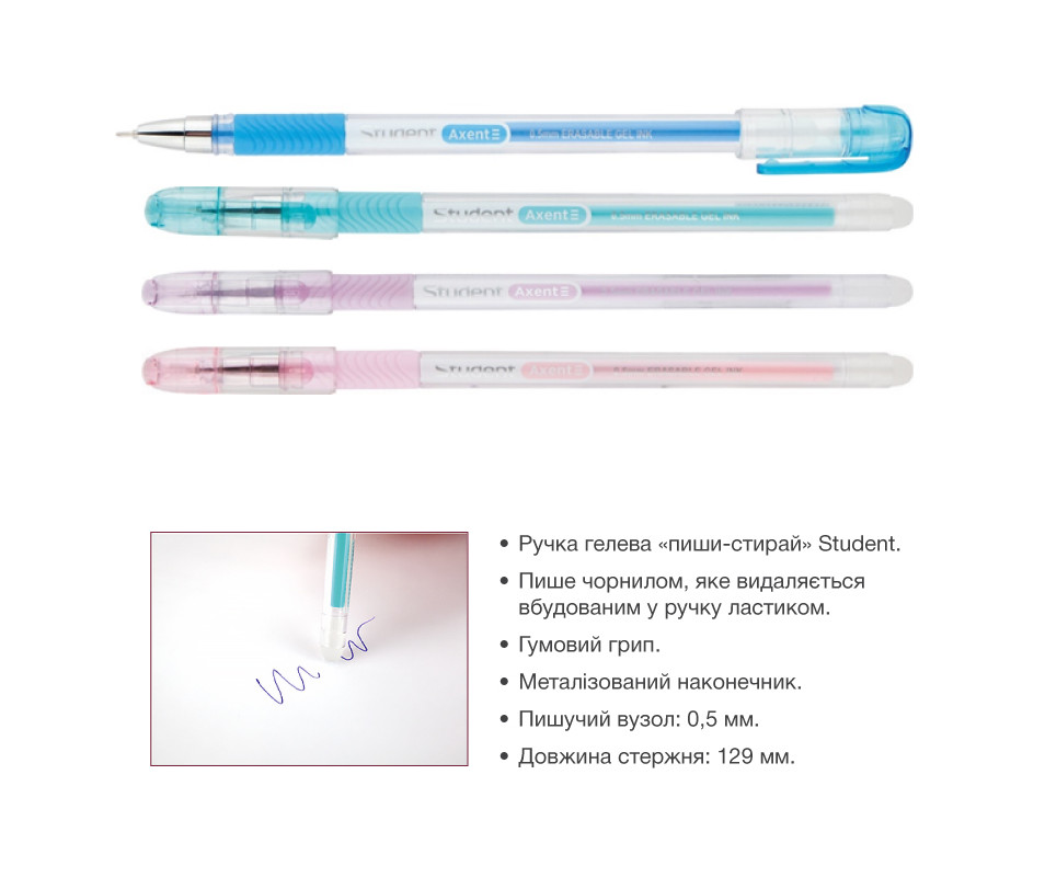 Ручка" "пиши-стирай" Student має корисну особливість - протягом 12 годин є можливість видалення запису з допомогою гумки, вбудованої в корпус. Чорнило стирається не за рахунок механічного стирання і відшаровування частинок гумки, а за рахунок властивостей самого чорнила - чорнило нагрівається під час тертя і зникає при нагріванні до 60 градусів. Таким чином, чорнило видаляється без пошкодження паперу, тому ручка "пиши-стирай" зможе виручити в навчанні та інших сферах, де важливо не допускати виправлень і помарок. Завдяки гелевому чорнилу і високоякісному пишучому вузлу Premec ручка м'яко пише, вимагає мінімального натискання при письмі і залишає чіткий насичений слід. Має прозорий корпус з якісного пластику і гумовий кольоровий грип для зручності руки.