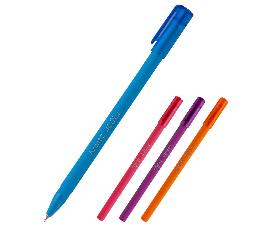 Масляная ручка Axent Mellow в ярком прорезиненном корпусе с металлическим конечником. Полупрозрачный колпачок с клипом. Лаконичный дизайн, ассортимент цветов.
