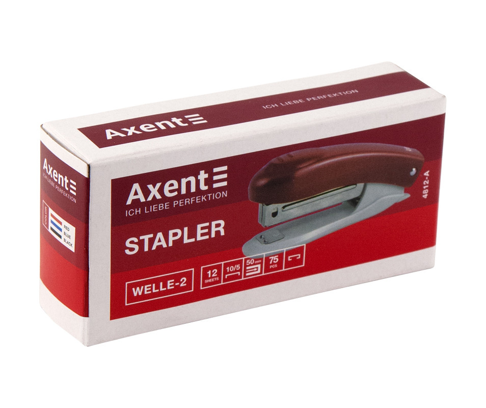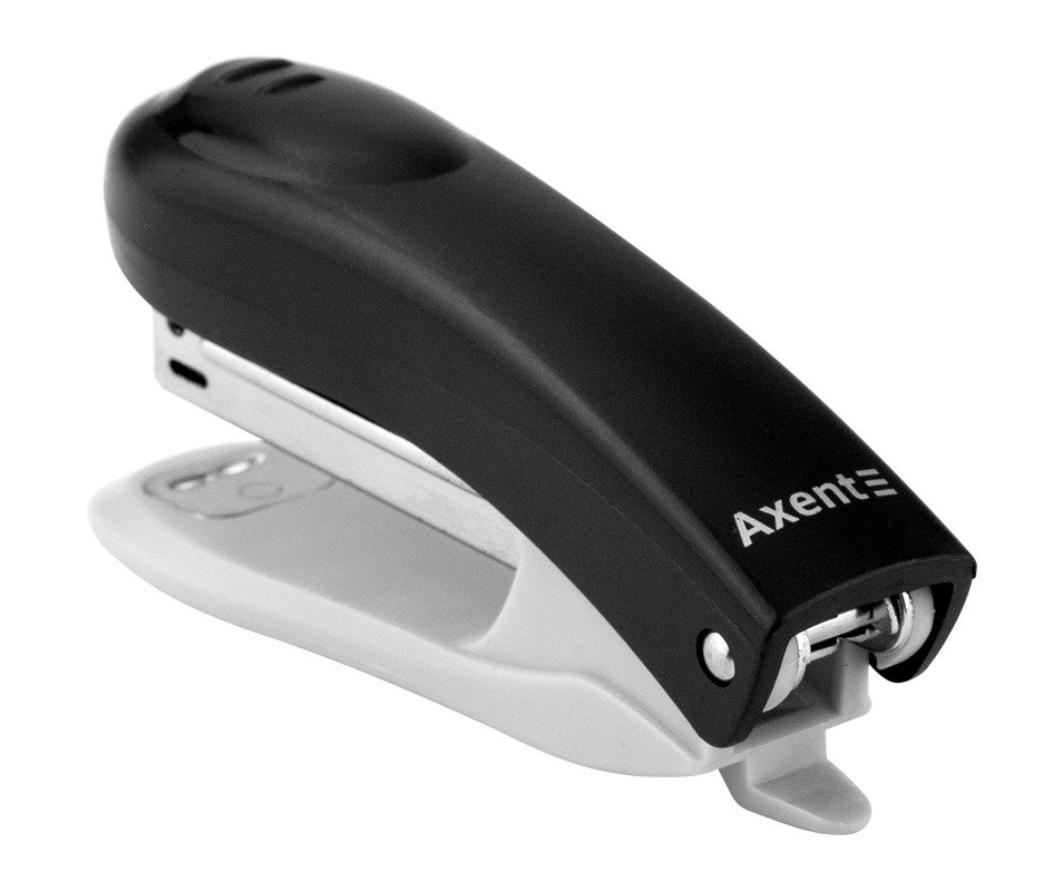 Stapler Welle-2 plastic, No. 10, 12 sheets, black 5628. The stapler of the Axent Welle-2 series has a "streamlined" design with an ergonomic lever that prevents the hand from slipping and increases the convenience of work. It is intended for manual or desktop binding of sheets of paper. Made of high-quality plastic - light and strong, resistant to loads. Easy to use - a reliable staple feeding mechanism made of strong metal ensures easy feeding of staples into the working area, binding without misfires and simple replacement of staples. It has a window for checking the presence of staples and a built-in destapler, which allows you to save time when you need to remove a staple. Classic colors.