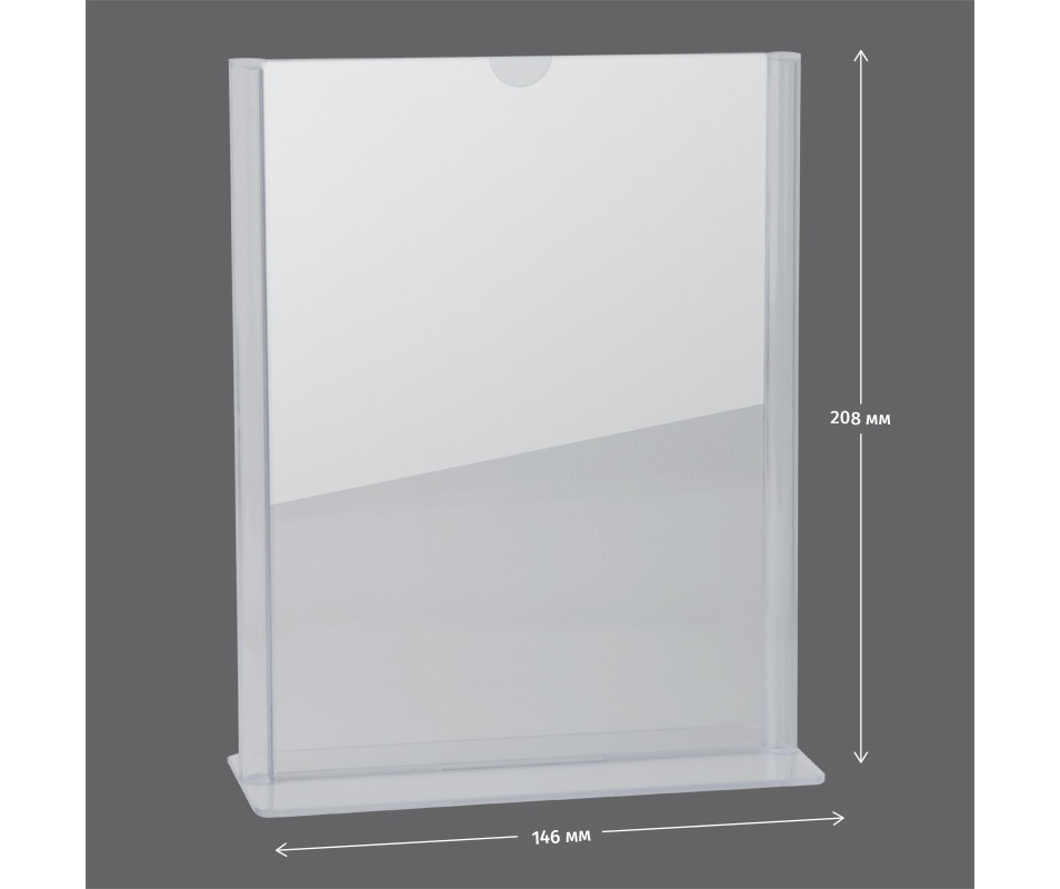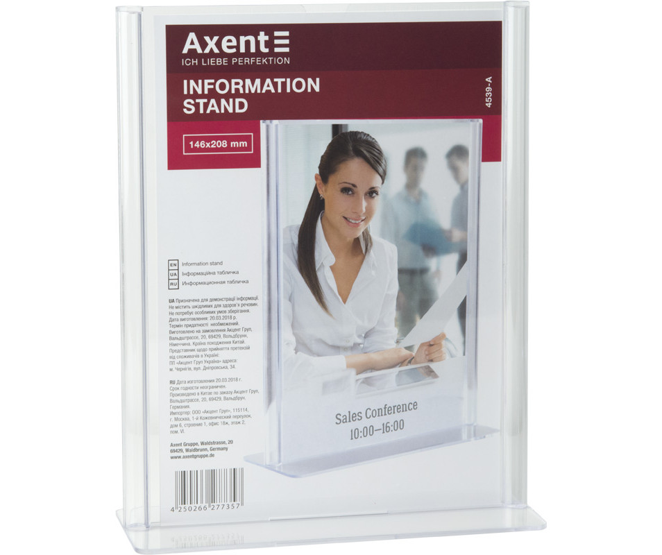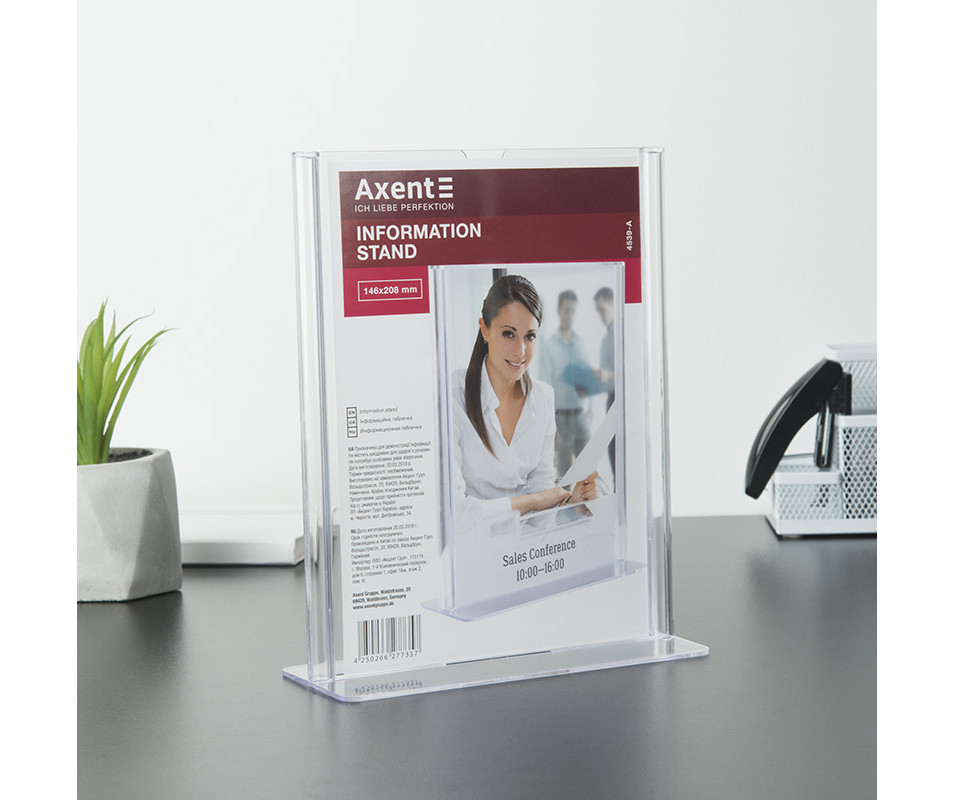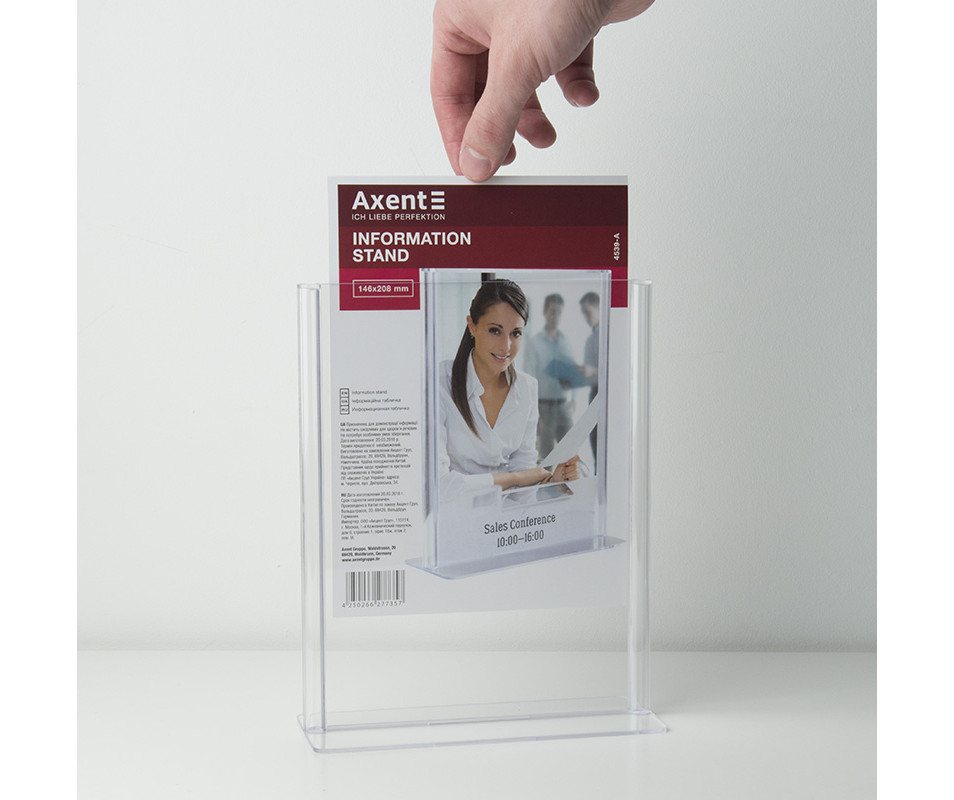 Двосторонні інформаційні таблички широко використовуються для розміщення реклами та іншої інформації при роботі з клієнтами - в банках, ресторанах (наприклад, спеціальні меню), на рецепції готелів, в салонах краси і т.д. Табличка інформаційна двостороння Axent виготовлена з кришталево прозорого пластику (полістиролу), який не порушує передачу кольору і чіткість зображень. Зручна виїмка для пальців дозволяє легко замінити вкладиш в табличці.
