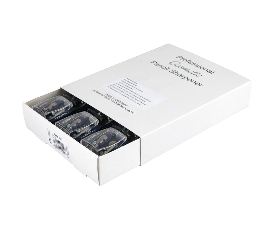 Cosmetic sharpener with cont. 6023 double 6143. Plastic sharpener with a container for sharpening cosmetic pencils (ordinary - 8 mm and thickened - 10 mm). The unique patented system of double blades gives the slate a rounded shape. A stick for cleaning the blades is included.