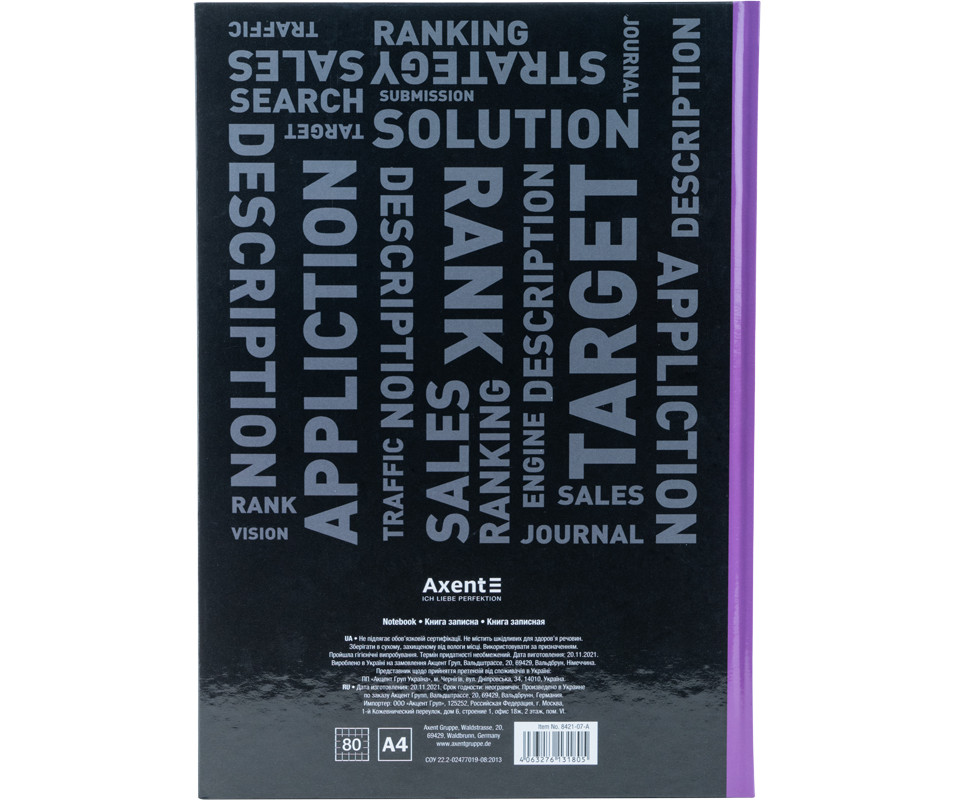 Записна книга Axent Colors 8421-07-A фіолетового кольору є незамінним аксесуаром для щоденних записів, обліку, створення схем, графіків та фіксації великого обсягу інформації. Вона має тверде переплетення і обкладинку, що гарантують збереження акуратного зовнішнього вигляду під час використання. Білий папір з клітинкою забезпечує комфортне письмо. Розмір клітинки складає 5x5 мм. Книга містить 80 аркушів, що дозволяє зберігати значну кількість інформації. Папір має щільність 55 г/м2, що забезпечує рівномірне писання без просочування чорнила на наступну сторінку. Книга має стандартний формат А4 і є ідеальним помічником для організації щоденних планів і записів у стильному фіолетовому дизайні.